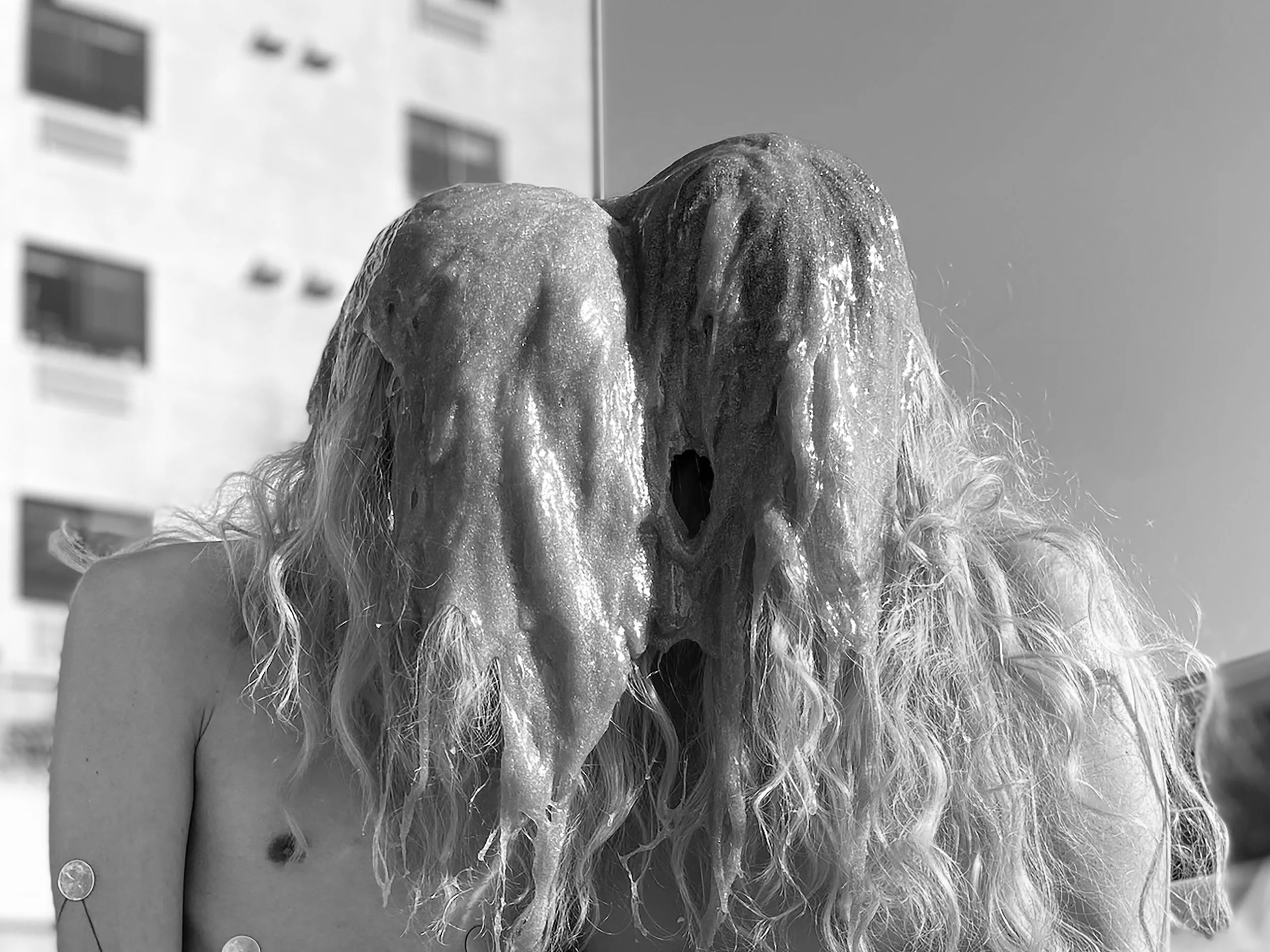 The performance opens in the museum gallery with Lee’s slow, reflective movement—casting light across the space in response to Kwak’s Glitter Manifesto. The artists then come together in a shimmering embrace as Han baptizes Kwak and Lee in liquid glitter. Veiled, bound, and visibly transforming as the glitter begins setting on their skin, Han guides the artists through the streets in a slow procession toward the Stonewall National Monument at Christopher Park. Audience members are invited to walk with them—as witnesses, protectors, and chosen family.